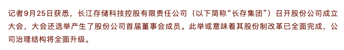 值得一提的是,9月25日,据媒体报道,长存集团召开股份公司成立大会,大会还选举产生了股份公司首届董事会成员。此举或意味着其股份制改革已全面完成,公司治理结构将全面升级。