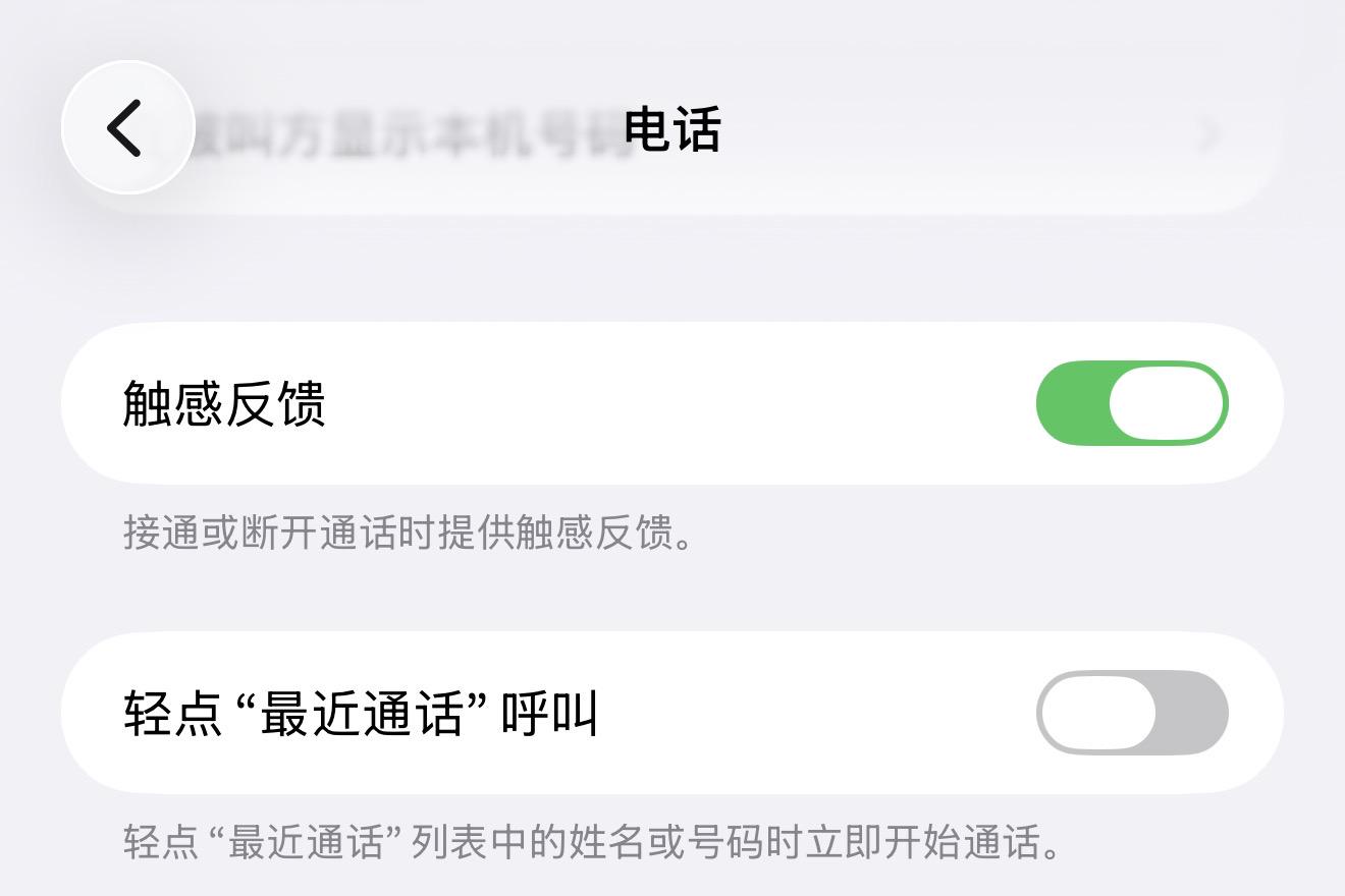 苹果在「电话」设置中加入了一个「触感反馈」的开关。关闭后,接听或挂断电话时将不再有震动提示。大家同样根据个人偏好选择开启或关闭。