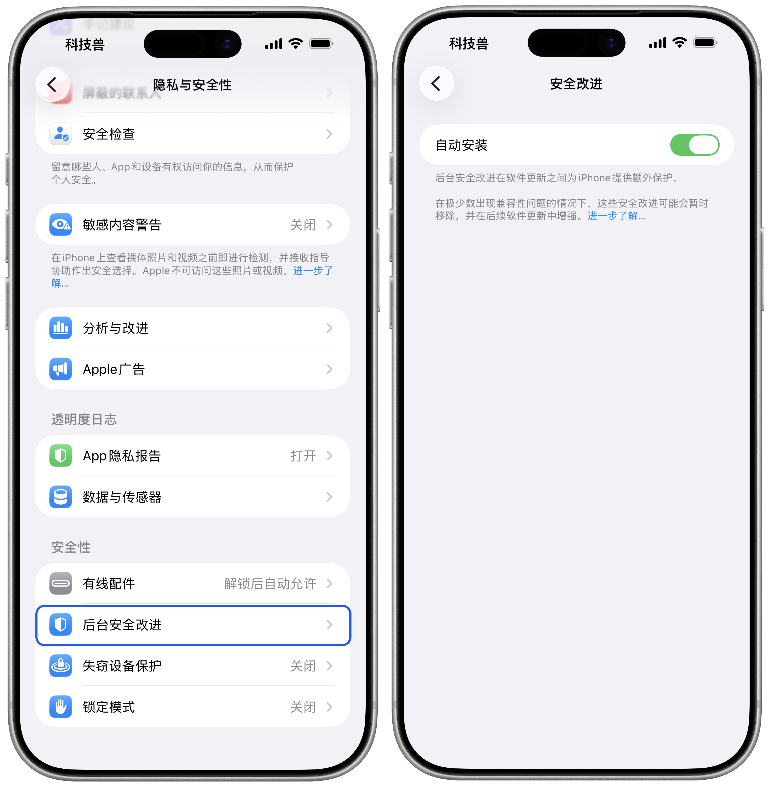 开启这项功能则允许 iPhone 在无需更新系统的情况下,自动安装安全补丁。这意味着,一旦苹果发现 0day 漏洞,即可快速向用户发布修复,用户无需等待完整的系统更新。