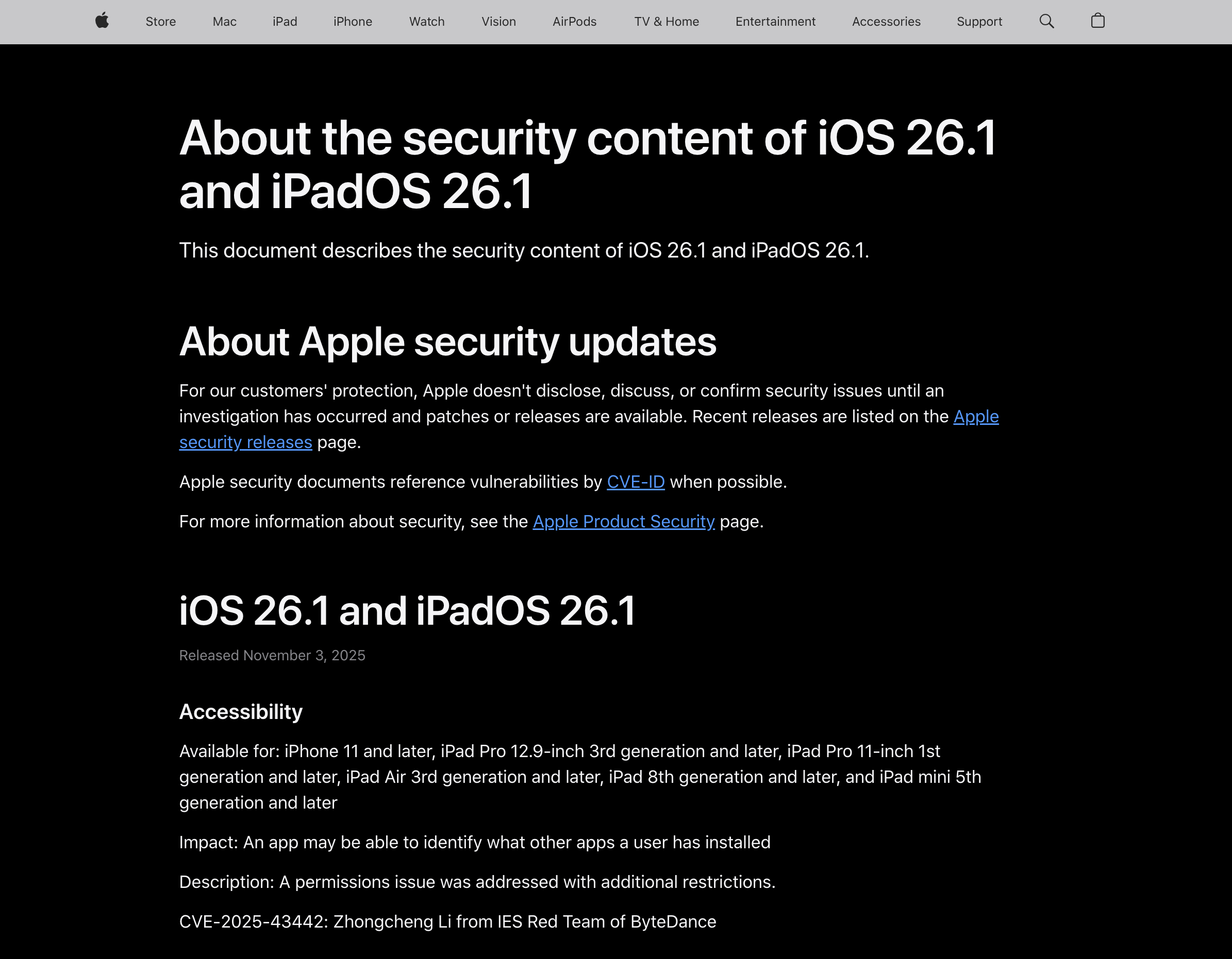 从此前测试版的使用体验来看,iOS 26.1 重点提升了系统的稳定性及流畅度,根据苹果发布的安全内容说明,该版本修复了多达 45 项系统及功能漏洞。