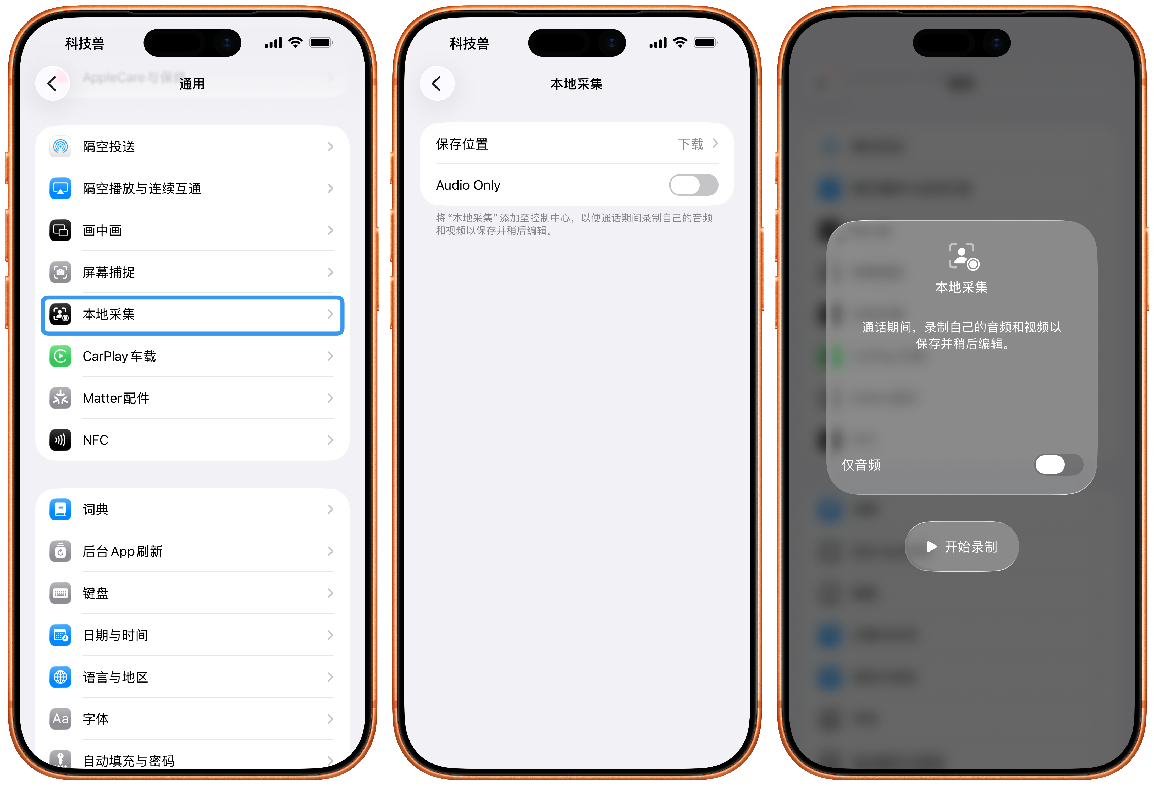 通过控制中心添加本地采集功能即可使用,这项功能设计初衷是采集用户自身的音视频,无法完整替代通话录音功能。如果需要录制对方的声音,则需要开启免提模式,但录音效果比较一般。