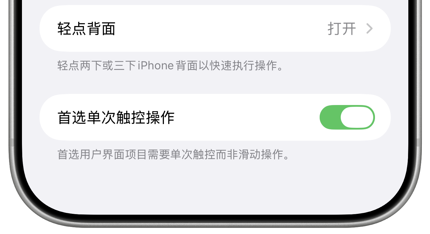 当然,如果你更习惯点击关闭,则可以在 iOS 26.1 的「辅助功能 - 触控」选项中,将新增的「首选单次触控操作」设为开启,即可恢复到传统的点击关闭。